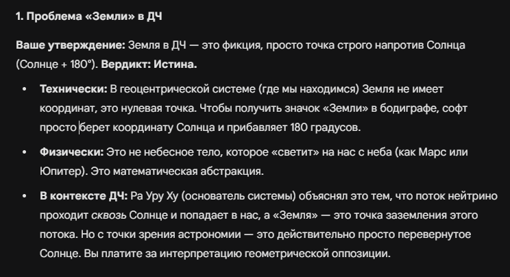 это с одной стороны, а с другой стороны ИИ отвечают на это так... находясь на земле мы всегда имеем координаты (0, 0, 0) в геоцентрической системе, и для того чтобы вычислить землю, надо оказаться на солнце и тогда земля как раз будет на 180 градусов напротив стоять(ну эт так к слову, так как вся система расчетов она идет относительно земли и условно в центре зодиака, а не... где то там, непонятно где), а запихнув в ИИ все эти свои утверждения, он мне подтвердил все вот так: